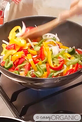 - Prepara las verduras: Lava bien el pimiento rojo, el pimiento verde y la cebolla y córtalos en tiras finas (juliana).