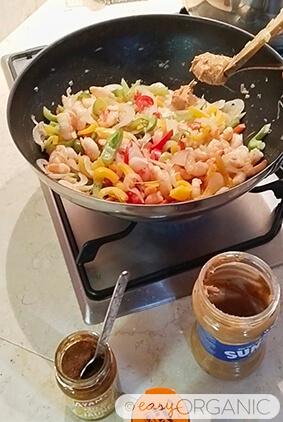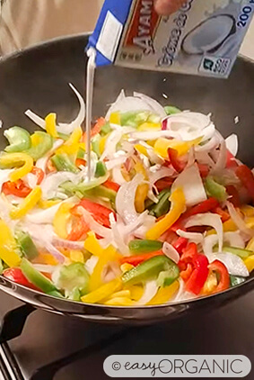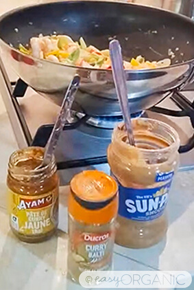 - Crea la salsa: Añade la leche de coco, la pasta de curry, el curry en polvo y la crema de cacahuete. Remueve bien hasta que todo se integre y la cocina se llene de un aroma espectacular.