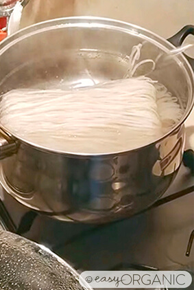 - Cocina los fideos: Mientras la salsa hierve suavemente, cocina los fideos de arroz siguiendo las instrucciones del paquete. Escúrrelos.