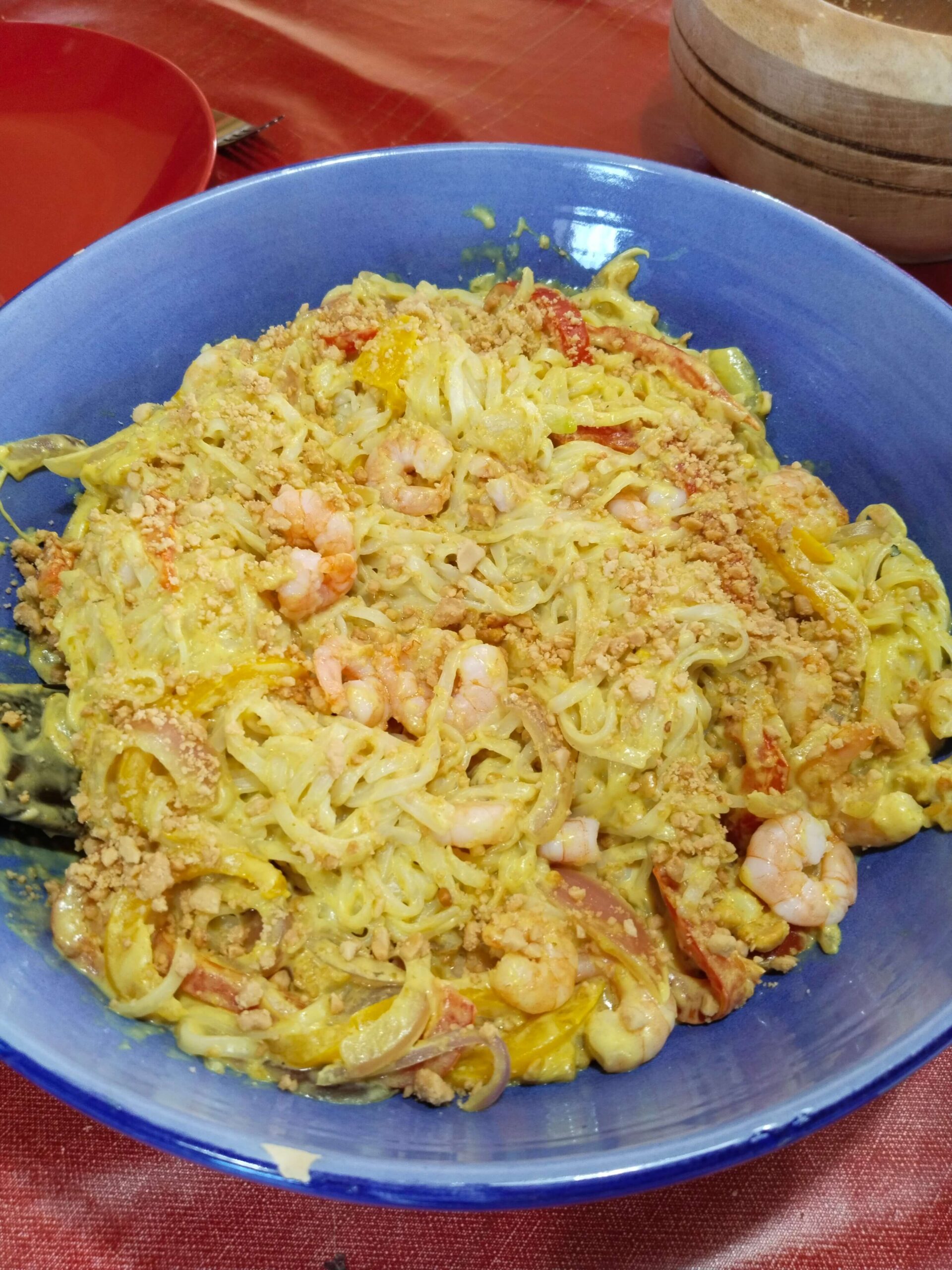 ¿Sabes esos días en los que necesitas algo sabroso, reconfortante y con un toque exótico? Estos fideos thai con verduras y gambas al curry son justo eso: una explosión de sabores que combina el dulzor de la leche de coco, el punto picante del curry y el toque crujiente de los cacahuetes. Y lo mejor es que puedes adaptarlo como quieras: sustituye las gambas por tofu, pollo o incluso tiras de setas y juega con otras verduras como germinados de soja o champiñones. ¡Cada versión será única!